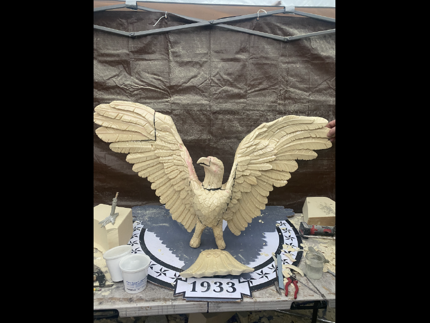 This set came about amid a very packed shooting scheduled in a long season of filming. Initially, it was supposed to be an insert shot. However, it kept growing with each successive meeting. There was very little time to do the research, master the research, and produce a set. As the Art Director In charge of the set, I had no supporting set designer, so I ended up having to draw the set myself. There was very limited research to go on. I had to extrapolate from the limited research available. I also had to coordinate with the Visual Effects department to incorporate the built portion of the set with the blue screen to adequately depict this historical scene. I had to coordinate with the Construction Department to produce files to be CNC cut by outside vendors and engineer the set so it would safely stand up to wind forces on the studio lot. The Construction Coordinator and I also worked together to schedule the sequencing of building, plastering, painting, and scenic aging of the various components to get the set ready on time. For example, we built the ceiling and raised it 7 feet with cranes so that the scenic artists could stand on the platform to plaster, paint, and age the ceiling before raising it to the 30 feet height required. I also had to do extensive research to find suppliers and later contact vendors to procure the spindles for the railings. With the limited research I had, I worked closely with the Graphic Designer to design the plaques and the presidential seal. I also had to commission a sculptor to carve the presidential seal based on my drawings and research.